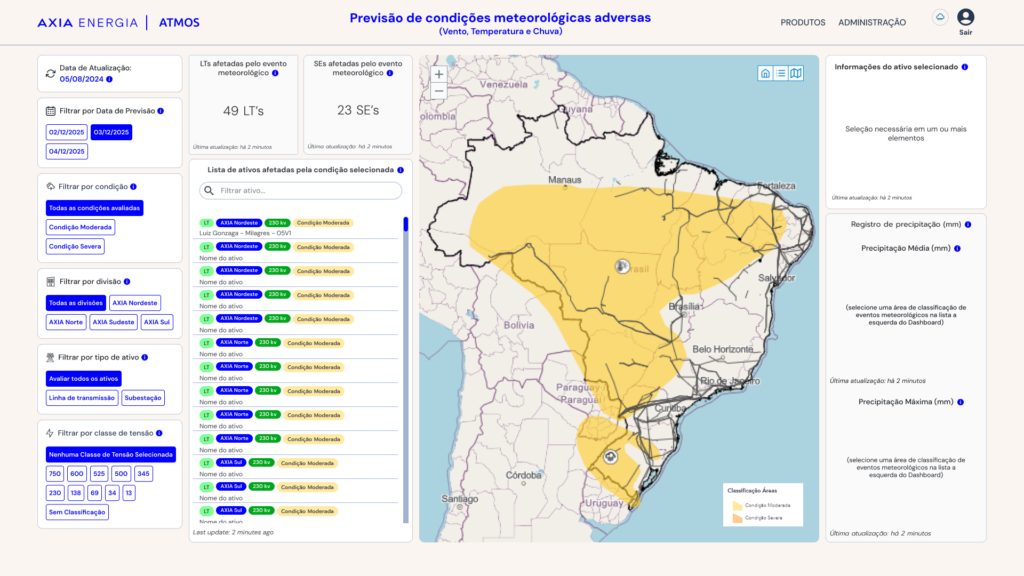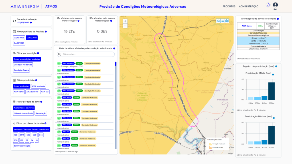 O Dashboard Atmos é um dos produtos que compõem o Portal Atmos, derivado do Projeto Atmos, uma iniciativa voltada à análise e monitoramento de eventos meteorológicos com impacto direto na operação e manutenção de ativos da AXIA Energia.