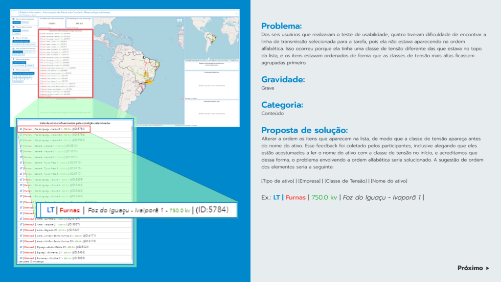 A definição das tarefas foi realizada em conjunto com stakeholders, com o objetivo de garantir que as análises refletissem o uso real do dashboard no contexto operacional. Foram estruturadas atividades centrais para a tomada de decisão dos analistas, como a seleção de ativos sob sua responsabilidade, interpretação das condições meteorológicas apresentadas na interface e a análise de precipitação em diferentes recortes temporais. Também foram levadas em consideração, tarefas relacionadas à navegação e seleção de subestações e  linhas de transmissão no mapa interativo, avaliando a clareza dos feedbacks visuais e a coerência dos fluxos de interação.